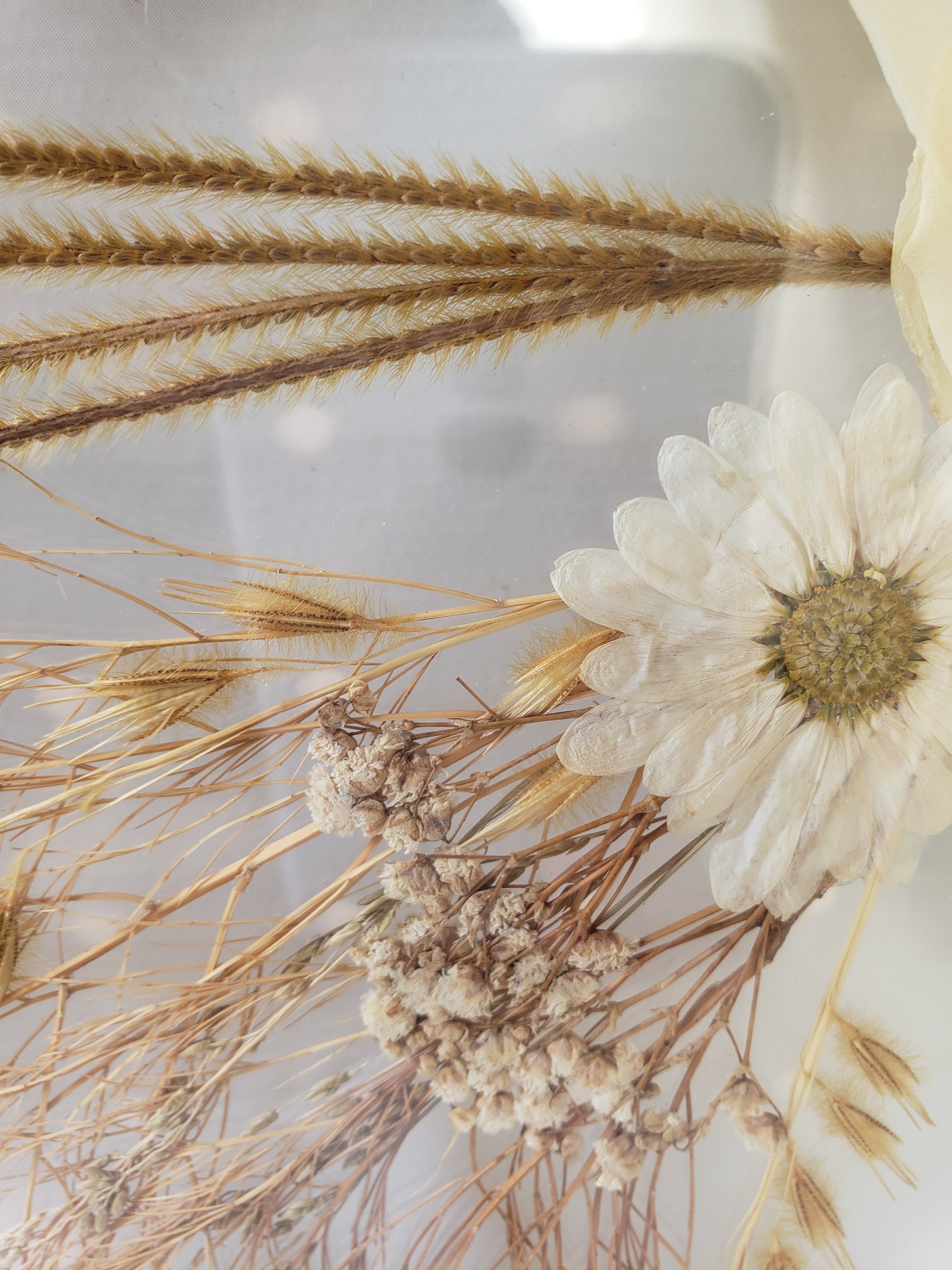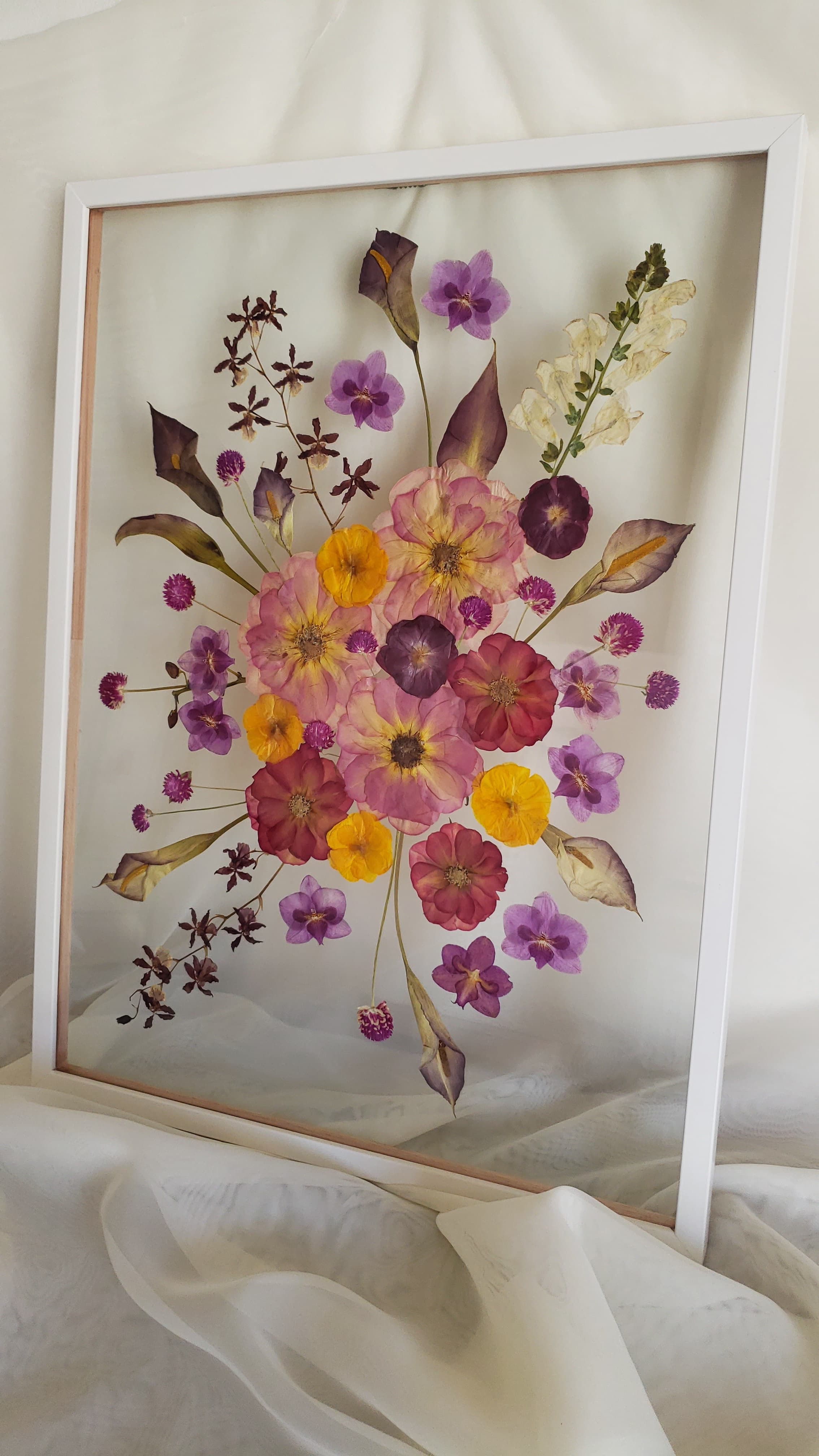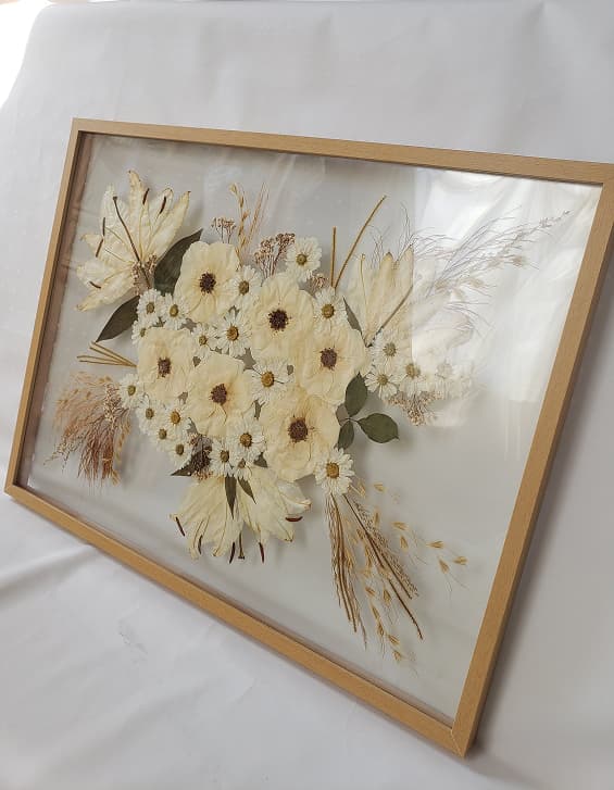 Cada quadro é criado a partir das suas escolhas: as flores, o formato, o estilo. O processo é manual, atento, e busca traduzir, com beleza e delicadeza, aquilo que tem significado para você. Seja como peça decorativa, presente simbólico ou releitura de um ritual afetivo, esta é uma maneira de preservar o efêmero e dar forma ao que se quer guardar.